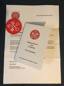 About I month ago I registered with the Confraternity of Pilgrims to Rome and received my pilgrim passport and badge. The passport is required for certain pilgrim lodgings along the way, and it’s also the official record of the pilgrim’s path.