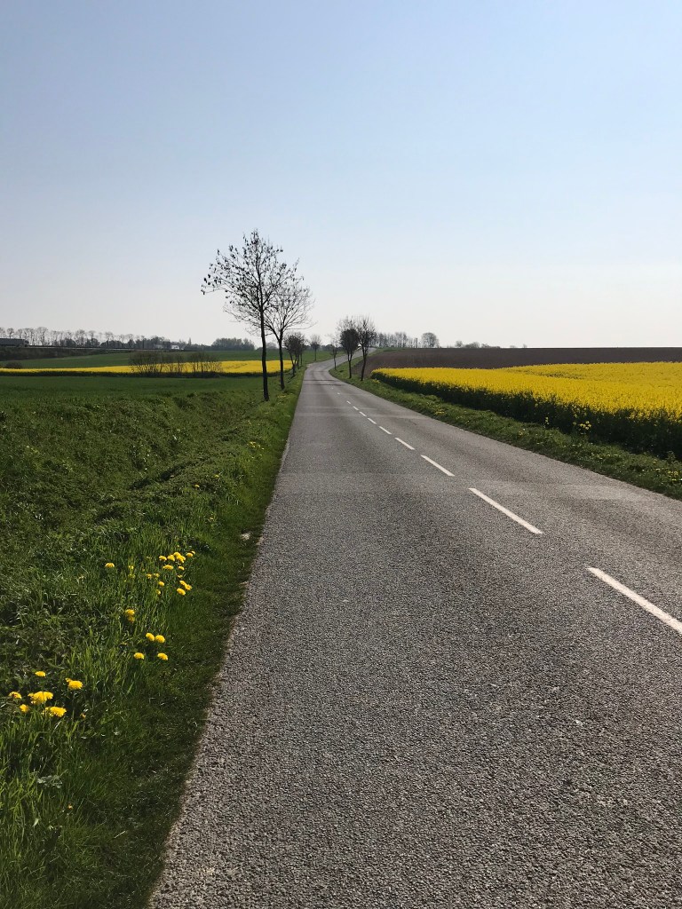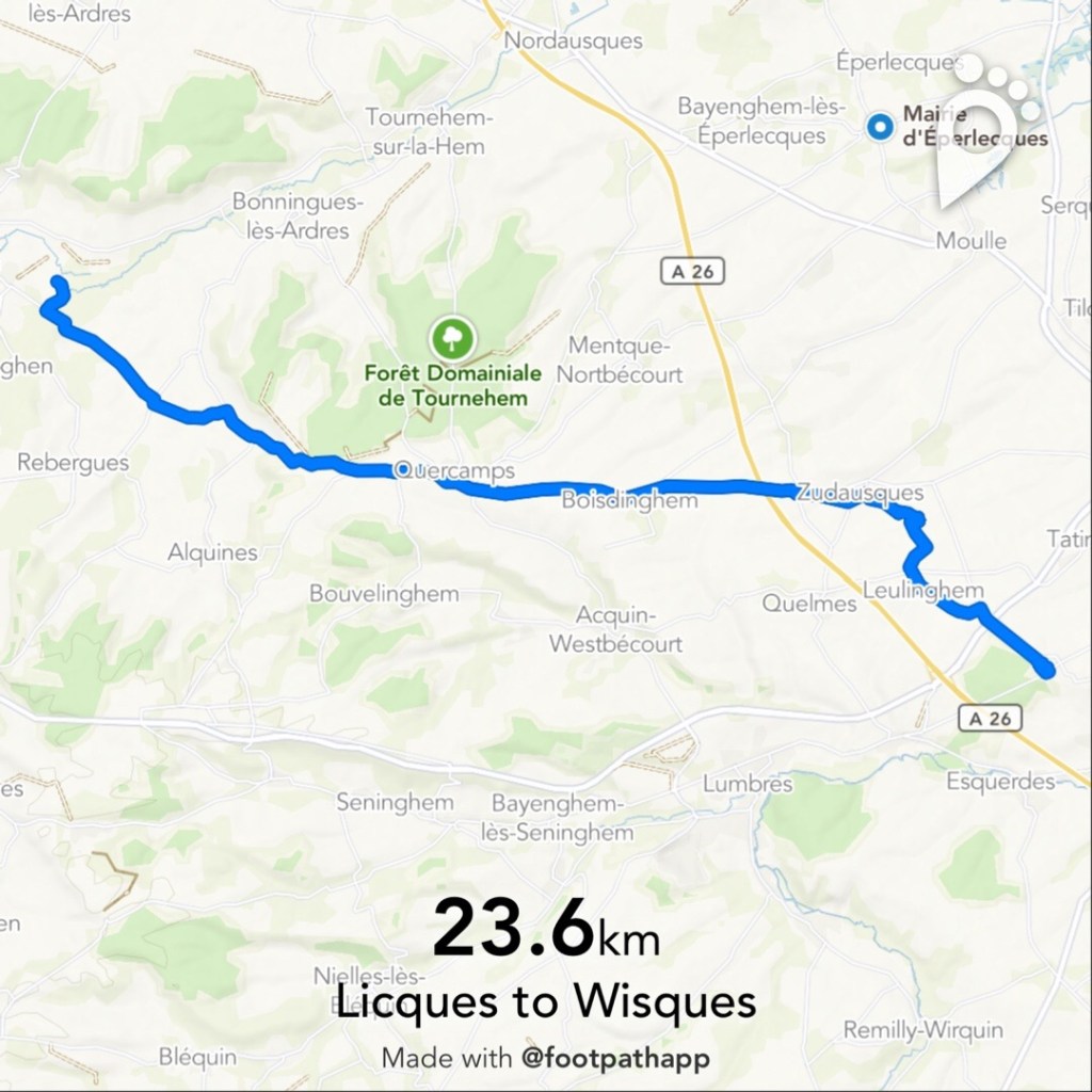 It was supposed to be a double stage today at roughly 33.5 km (Licques to Tournehem-sur-la-Hem and Tournehem-sur-la-Hem to Wisques), but if you look at that on the map, you’ll notice that Tournehem-sur-la-Hem is actually kind of in the opposite direction of Wisques for a bit, so you have to go north and then sharply back south. From what I can tell that wasn’t even really on Sigeric’s route but was added because Tournehem had a number of pilgrim services in this part of France that doesn’t seem to have many. Wisques is the real pilgrim goal in this stretch, with two Abbeys and a history of pilgrim hosting.