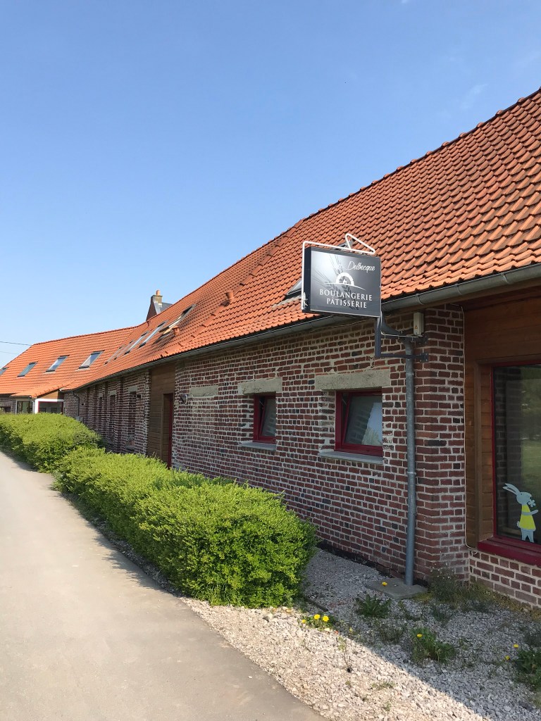 I was losing steam and hobbling along when out of nowhere a bakery appears. I got tomato baguette and some pastries that I saved for dinner tonight. Also, as I was leaving the bakery I spotted my first pilgrim of the day. I’d expected not to see any, but I think it’s where the Tournhem route meets up with the more direct route.
