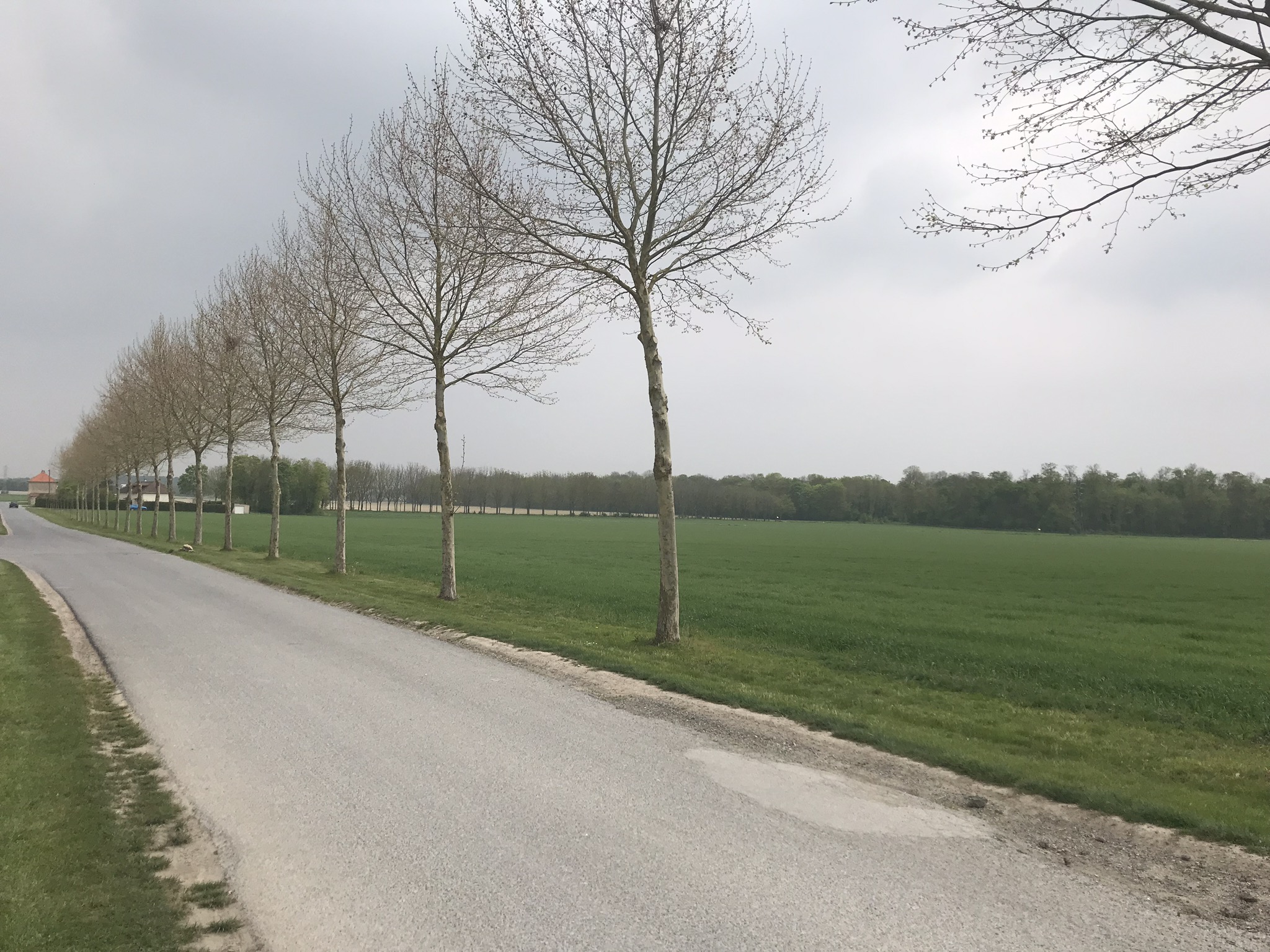 About 8 km outside of Reims it started to rain and a car pulled up next to me on the road with the trees below. A man was driving, and there was a fluffy black dog in the passenger seat. When I didn’t understand his French, he asked in English “Have you seen a dog that looks just like this?” I said “No, and I’ve been walking this road for about 20 minutes. I haven’t seen any dogs.” He said “Get in! You can help me look and I’ll take you to where you are going.”