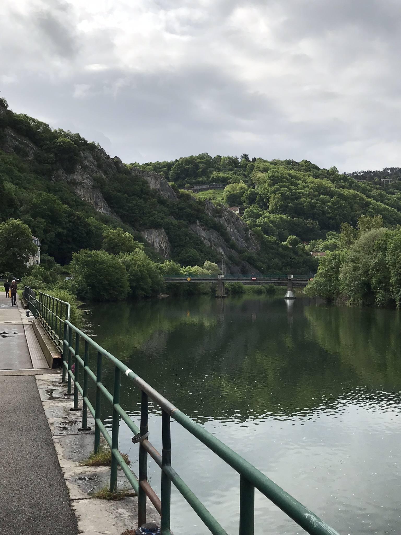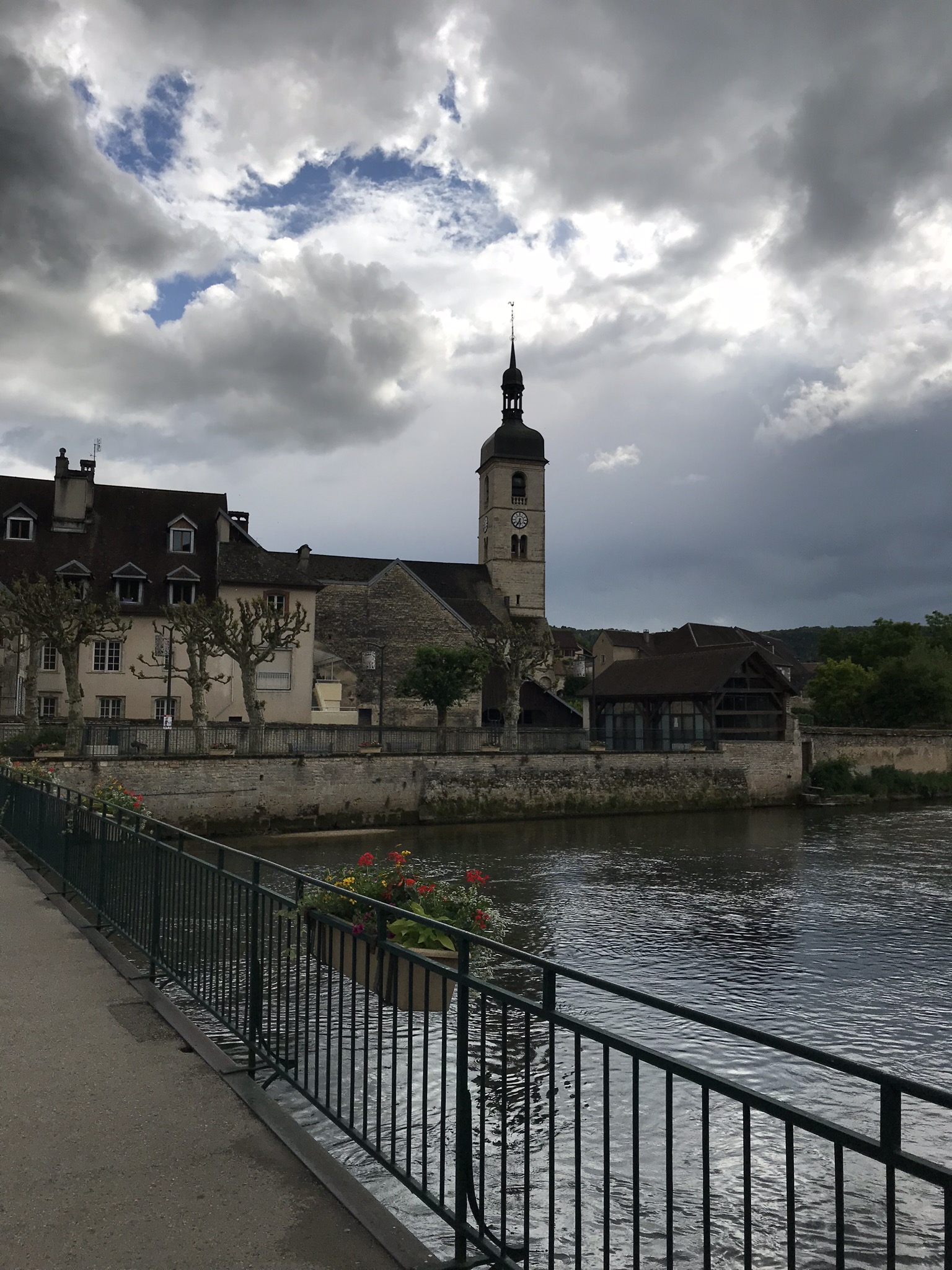 We left the center of Besançon and joined the Doubs River. It was supposed to rain all day to Ornans, but it was just damp so far, so we enjoyed the cool air and the quaint scenery.