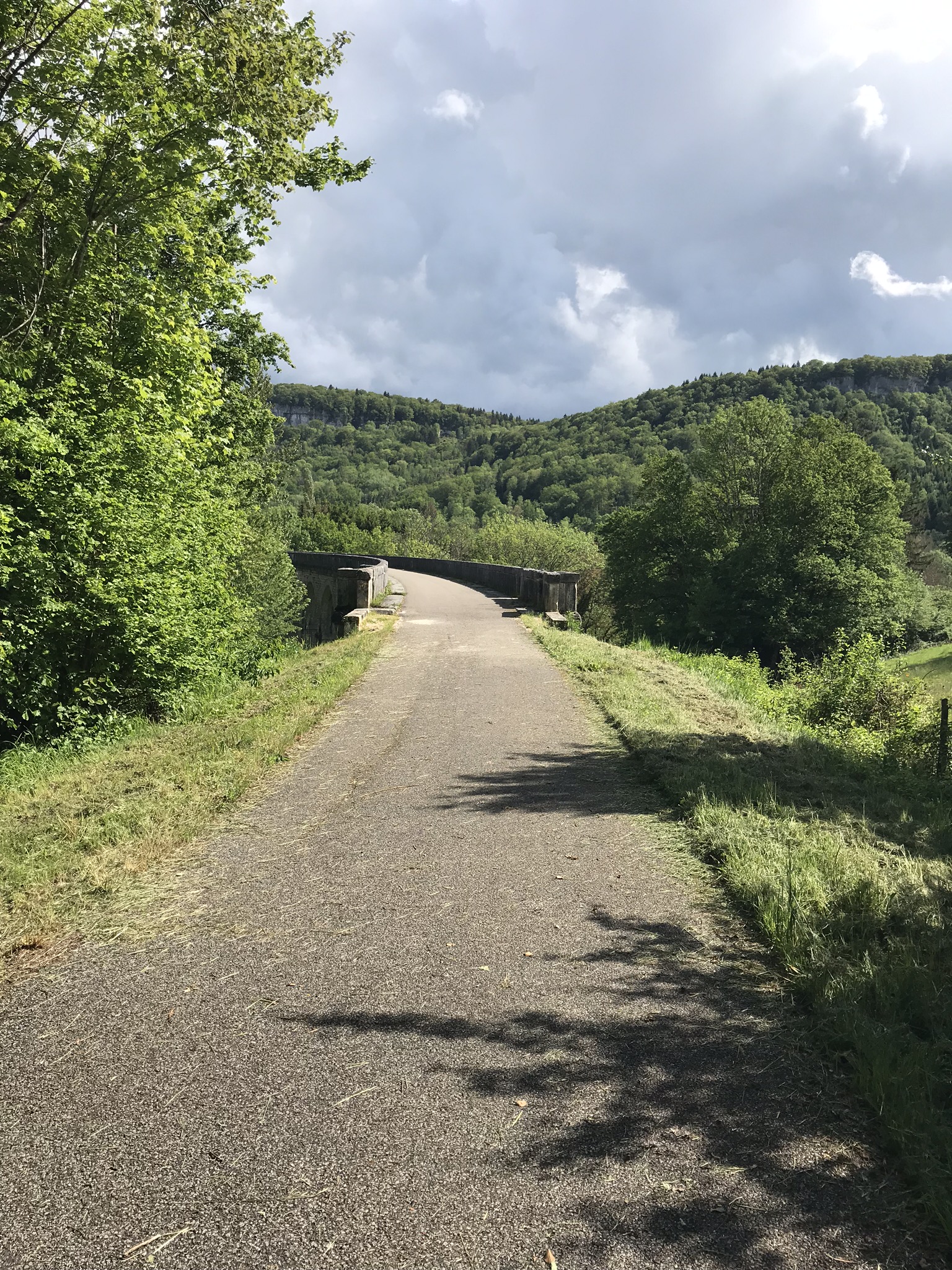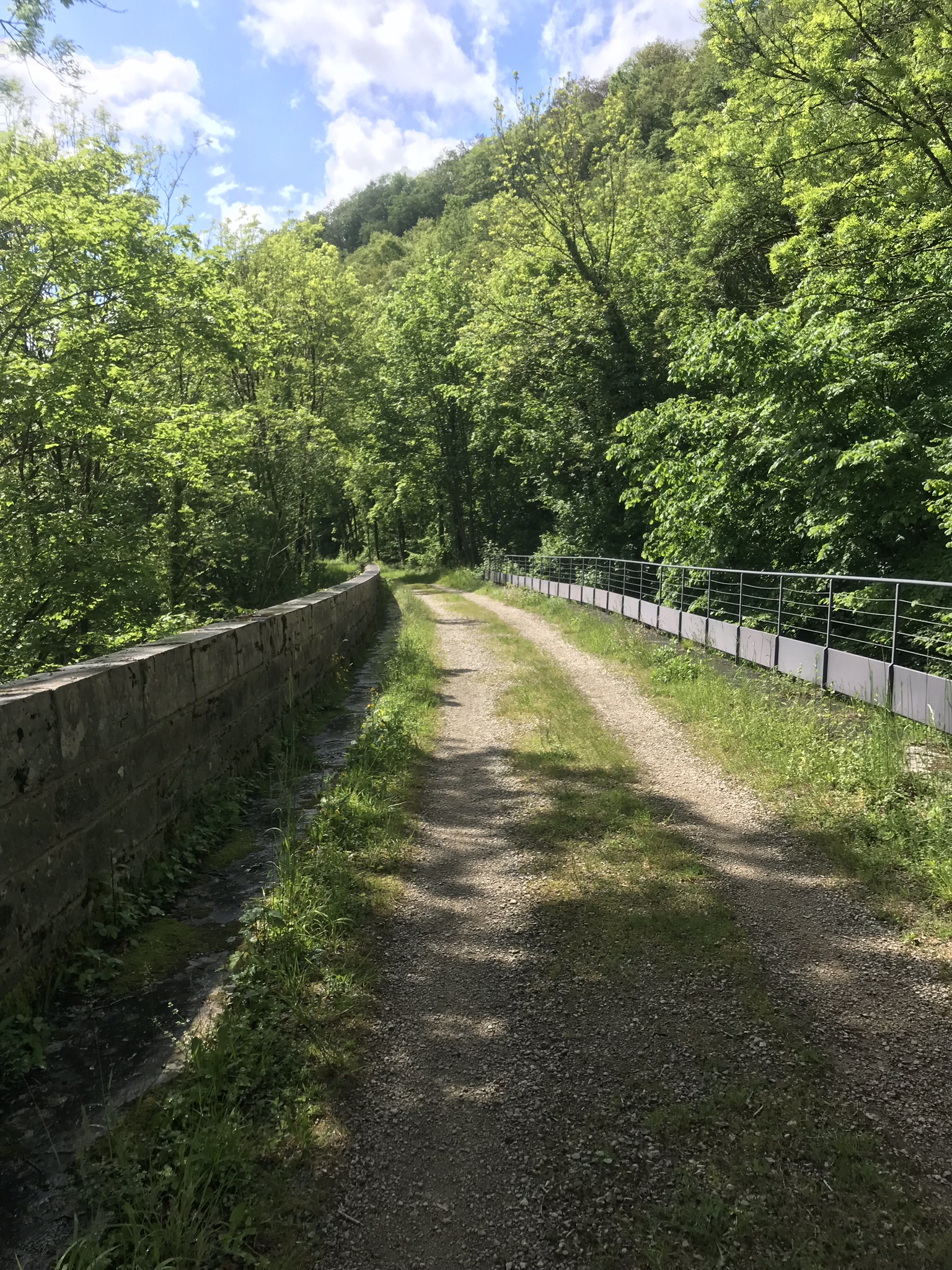 After a bit as we were getting closer to Ornans, the trail got really interesting–rock walls, bridges, and even a 180m tunnel. The tunnel looked a little creepy, and M got out a flashlight, but the inside had automatic lights that turned on as we walked past. t was still a little creepy–it felt like I was in an episode of Scooby Doo 🙂