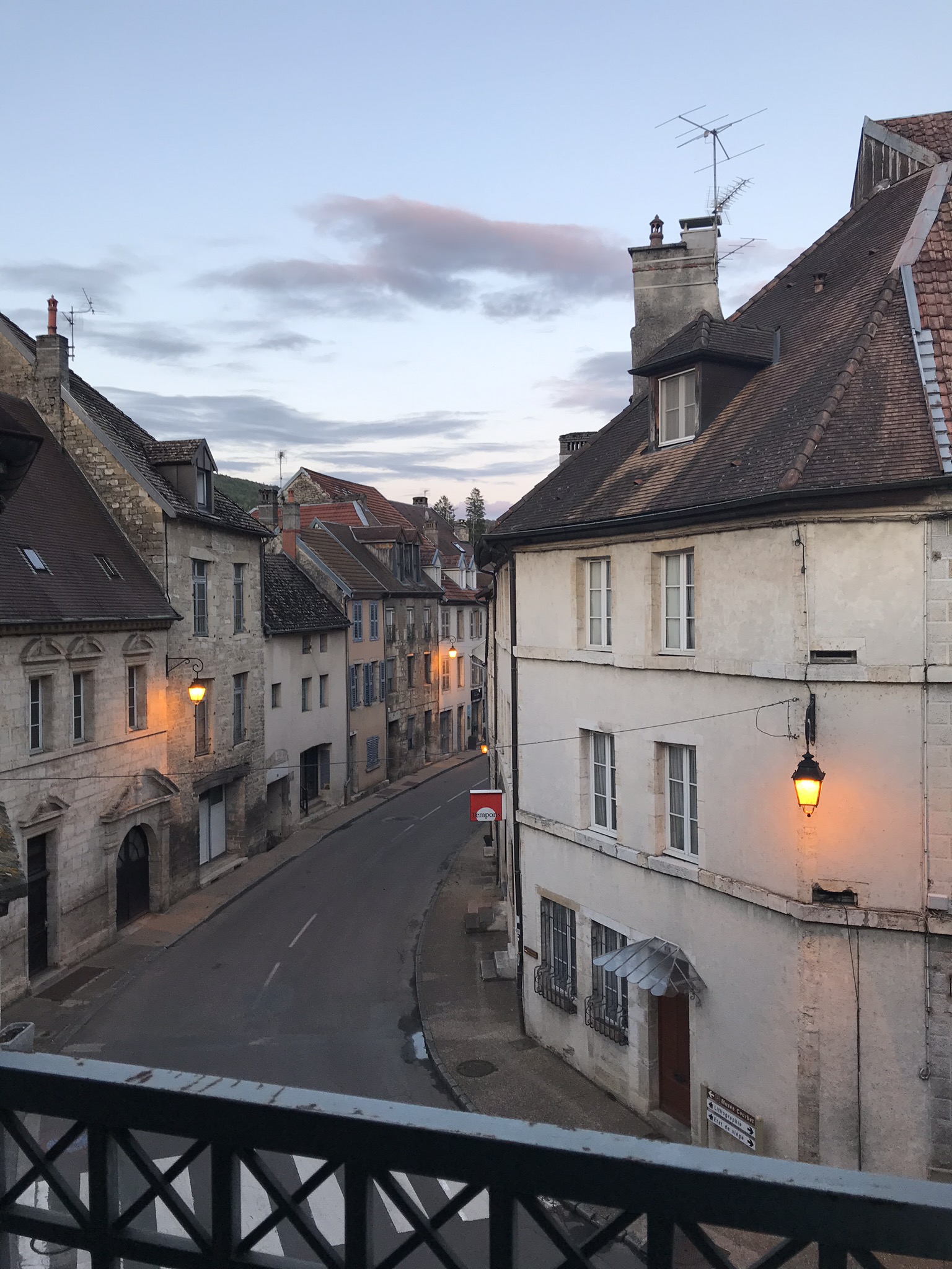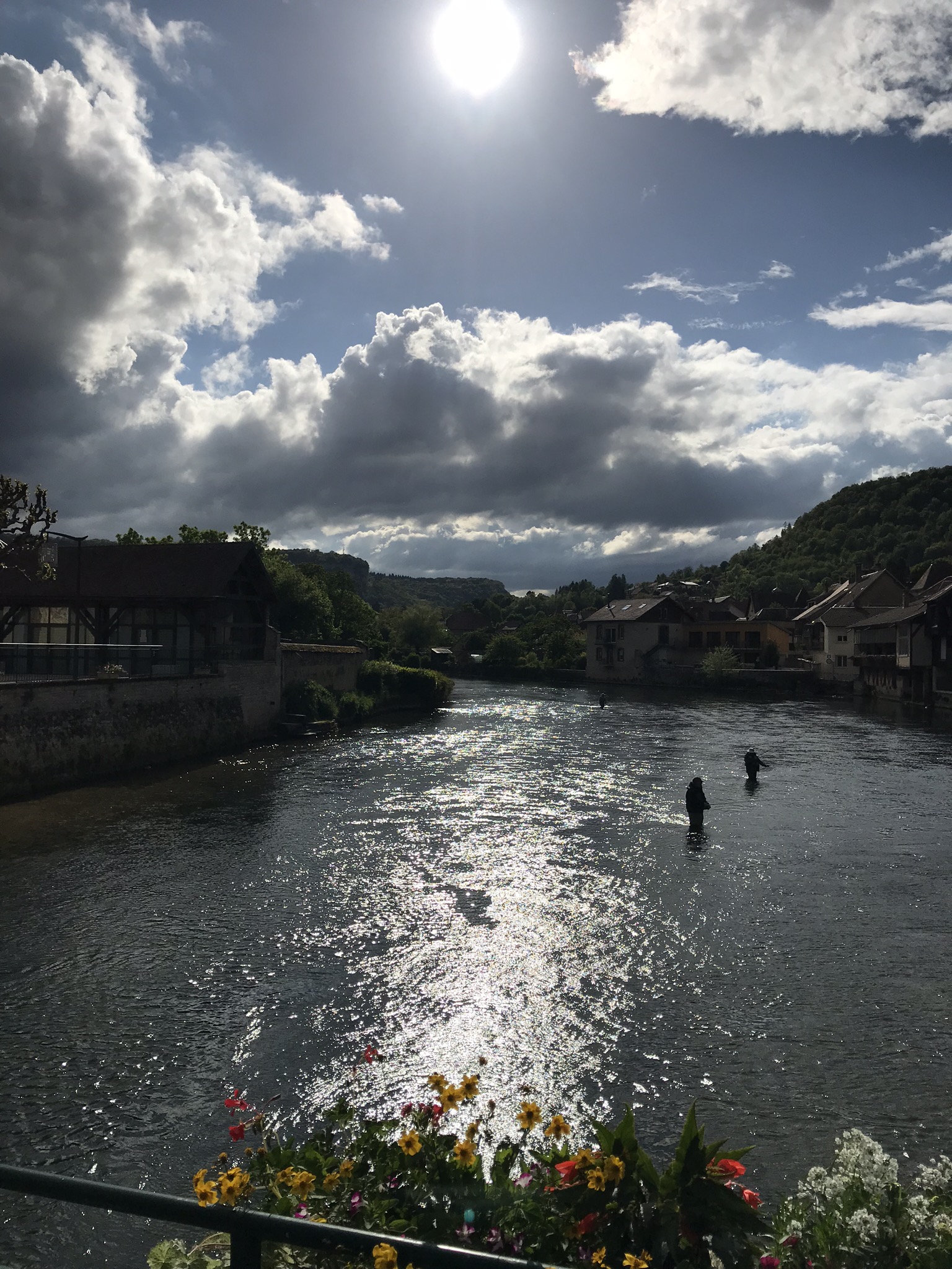 We eventually arrived in the the town square and turned right to cross the bridge over the Loue River. Our lodging is just left of that clock tower.