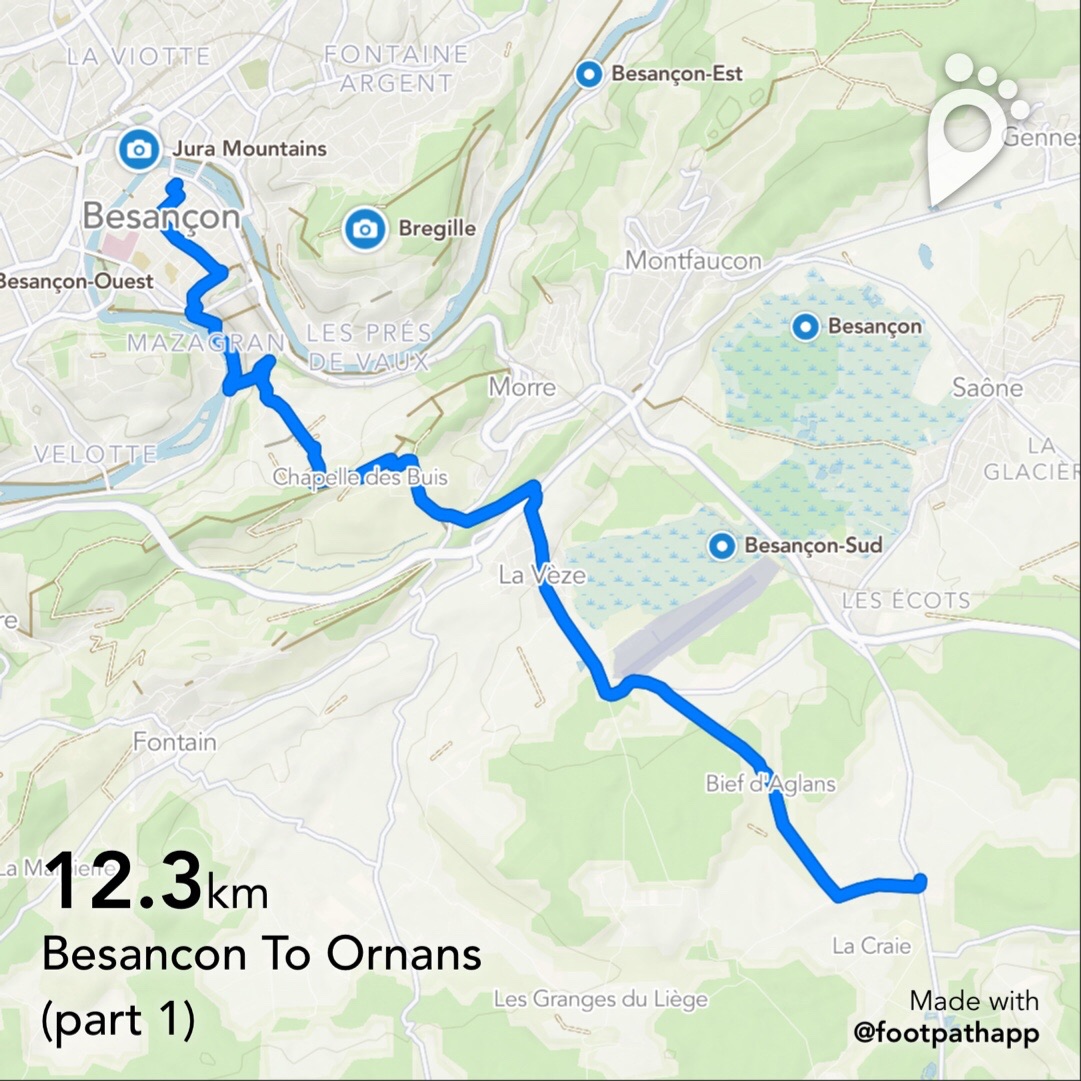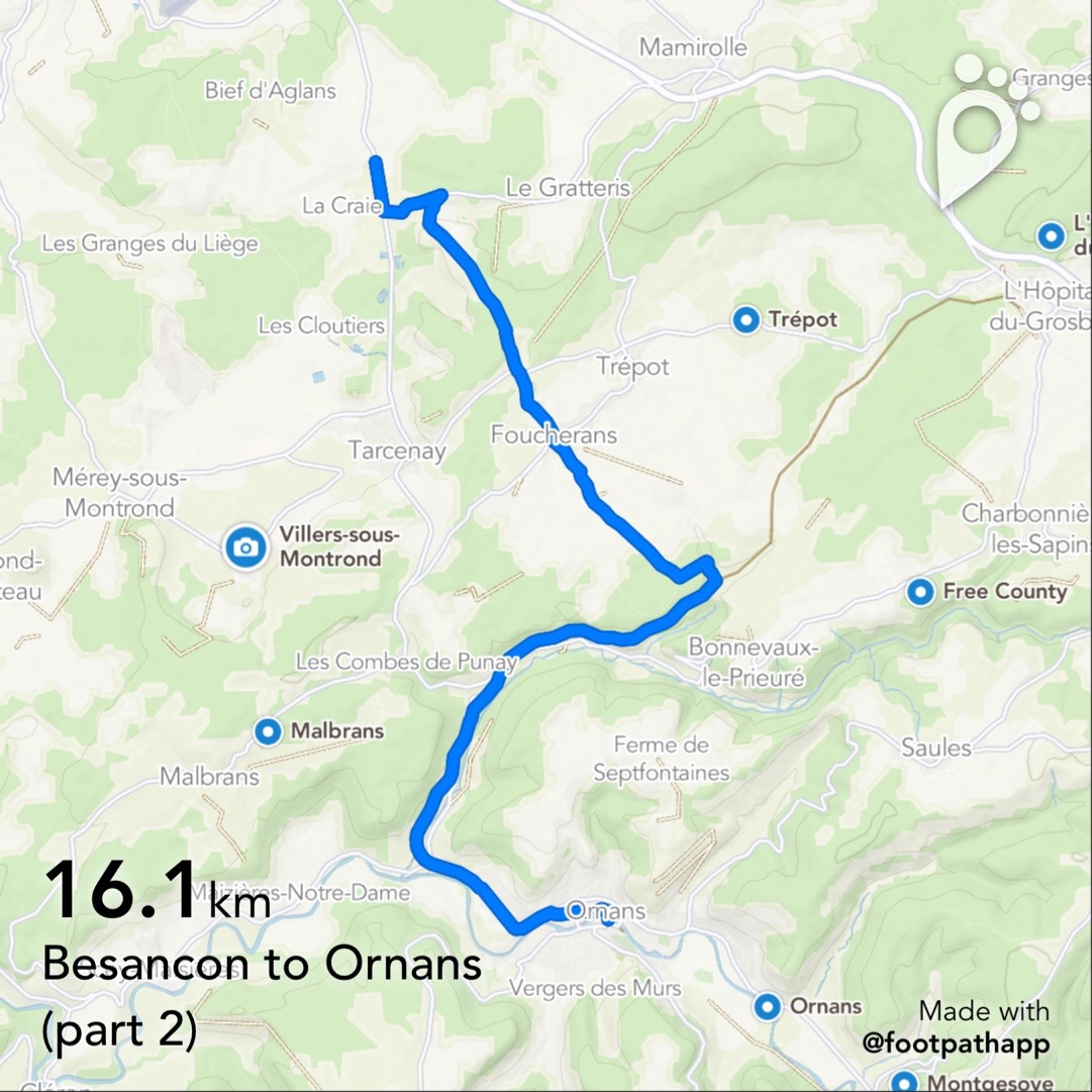 There was a hiccup with the footpath app, so our path is tracked in two maps, but together they chart what we walked today to Ornans (for a total of 28.4 km (17.6 miles))