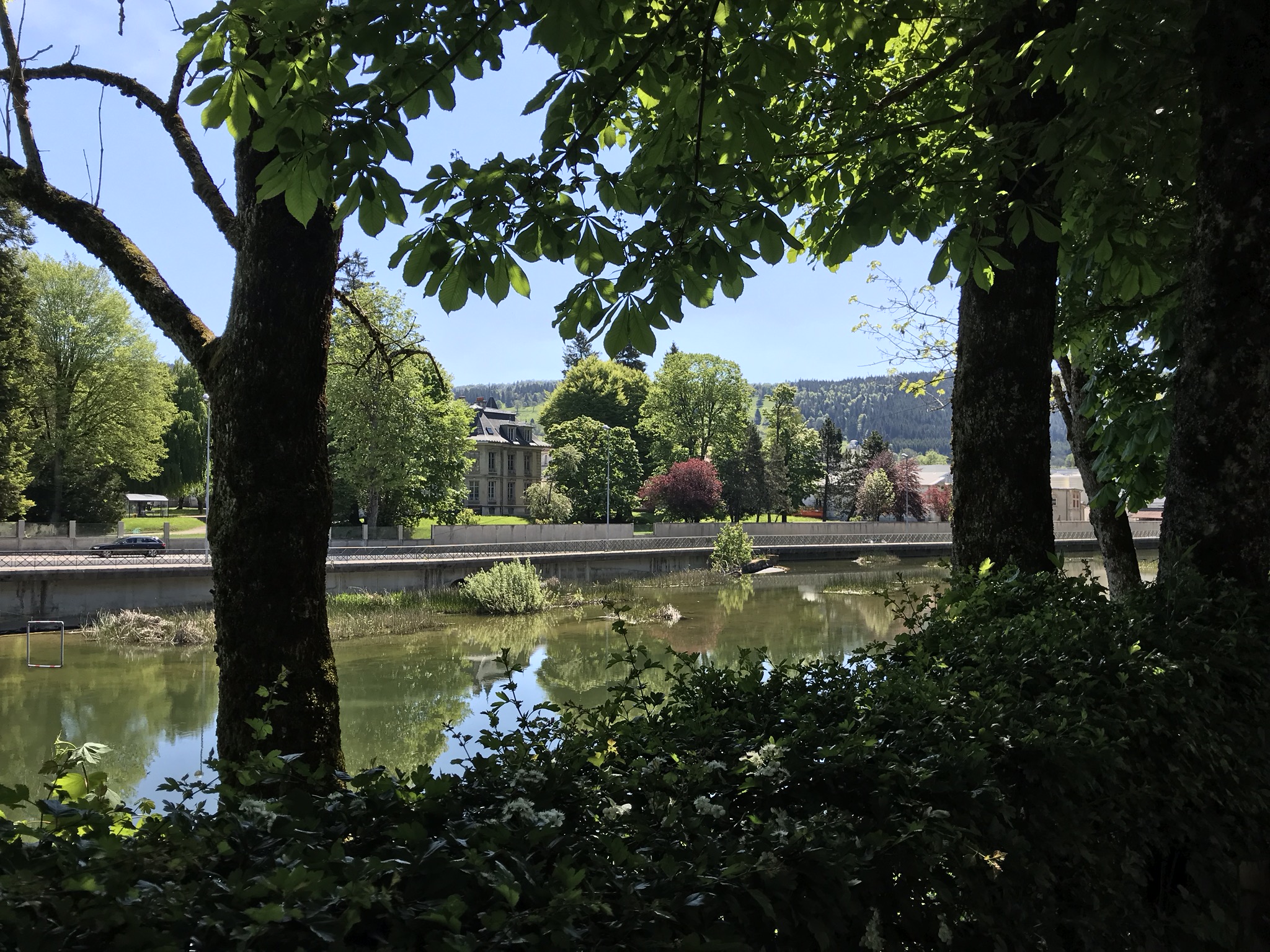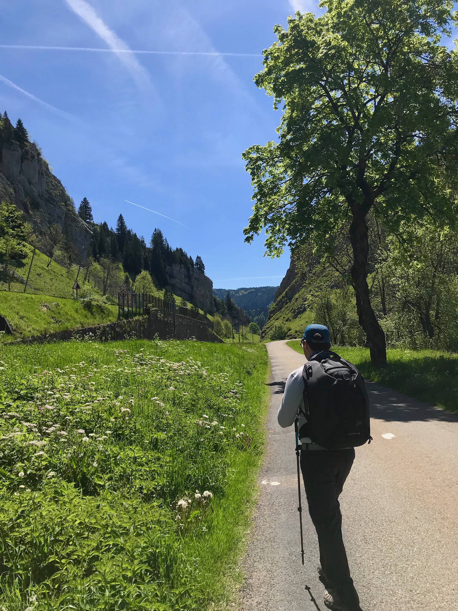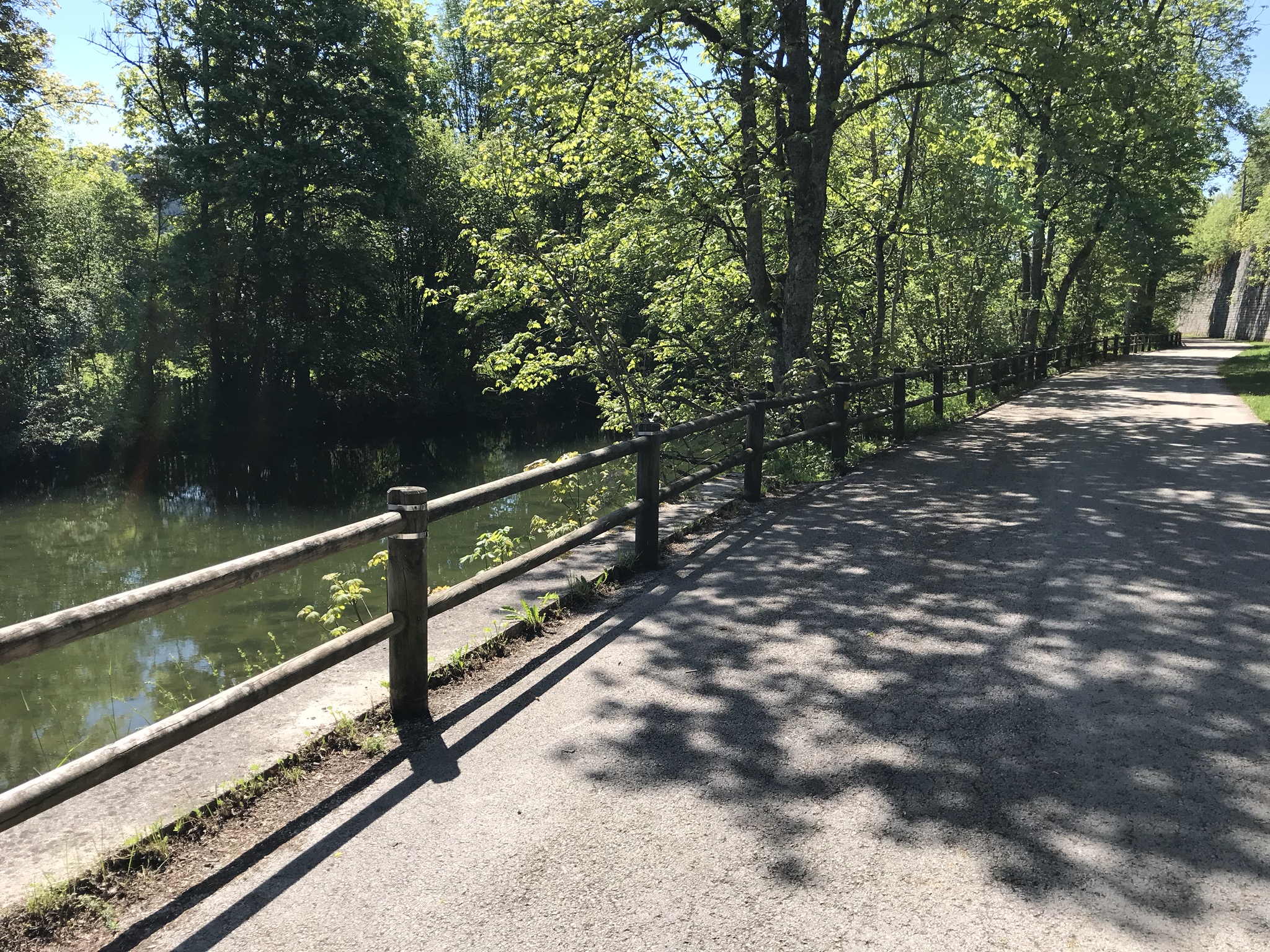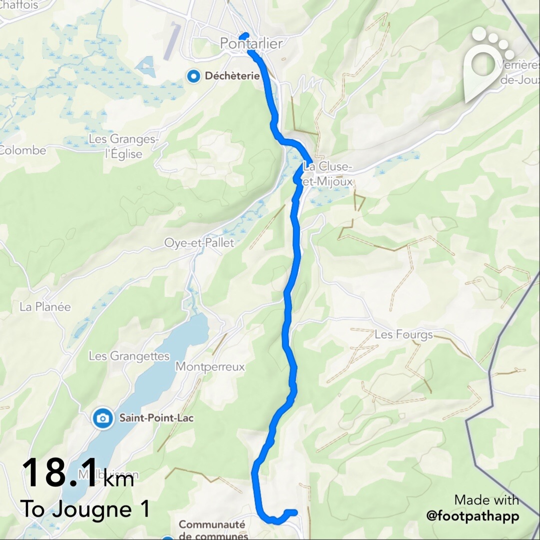 We had a leisurely morning and left Pontarlier around 11am. We left through the old arch and quickly joined the Doubs River footpath out of town. It was a beautiful and warm day.