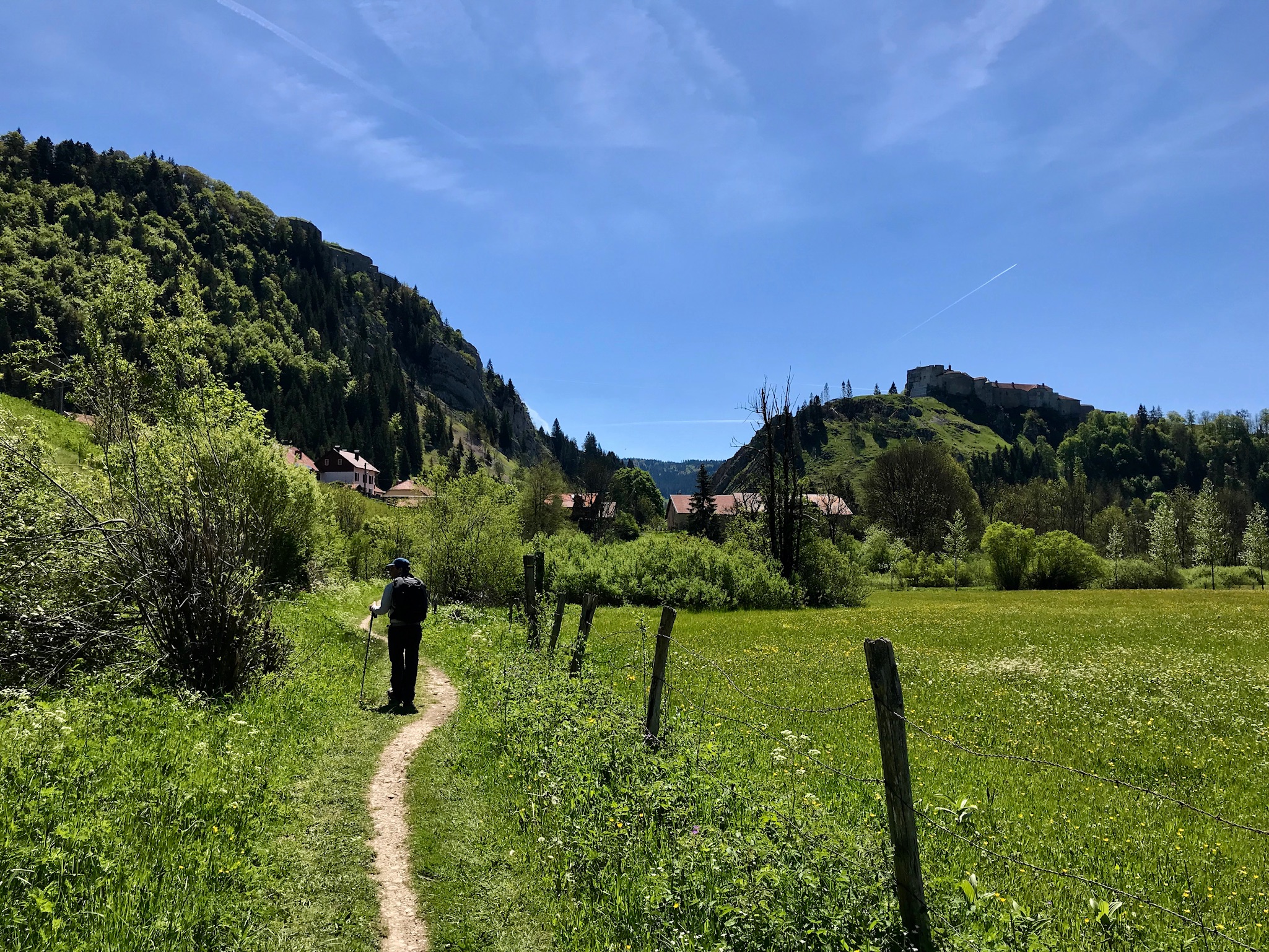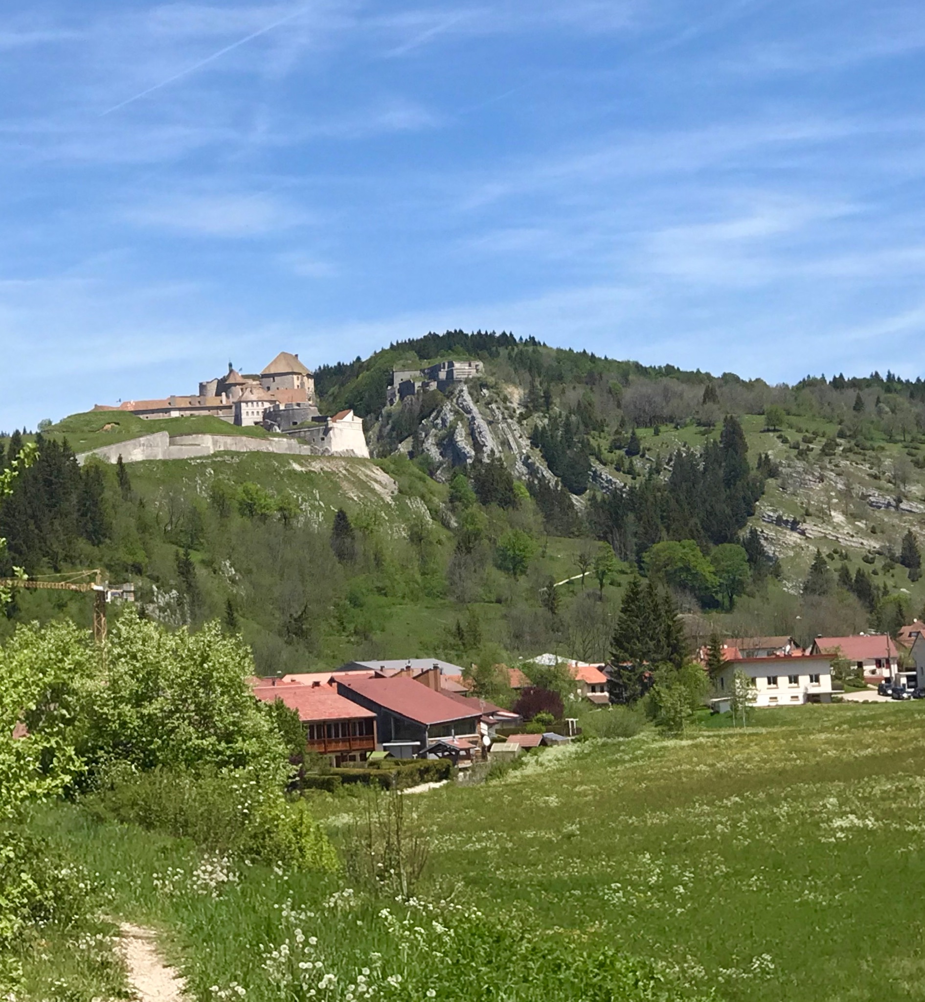 After about 1/1 1/2 hours the path opened up and we could see Château de Joux in the distance. It’s a 11th century fortress that guarded this part of the pass through the Jura mountains into France.