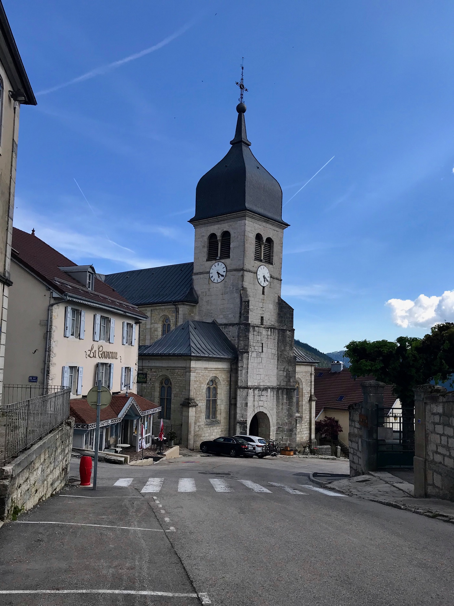 We entered Jougne and our hotel, Le Couronne, was right next to the church. Our room overlooked a pretty backyard. Though it was a relatively short day, we were hot and tired, so we quickly took showers, ate our dinner, and went to sleep. We cross into Switzerland tomorrow!
