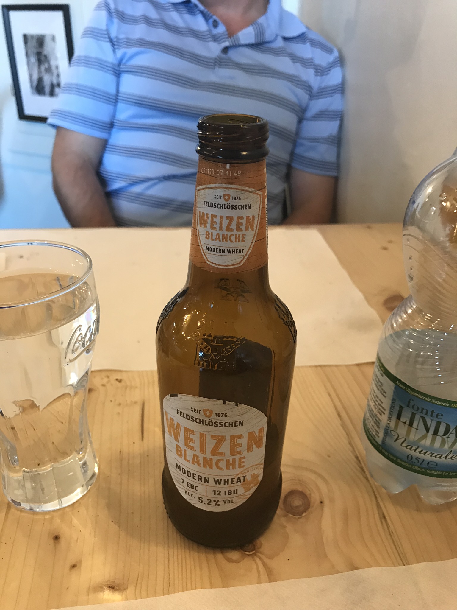Neither of us mind a bit of quirk and don’t have any tendencies toward snobbishness, so we enjoyed the personality of the place. Since it was Sunday, the hotel cafe was closed, as were most of the restaurants in town, but we found a pizzeria that opened in a couple hours, so we rested for a bit and made our way over. We each quickly downed three of these delicious beers and two pizzas (1 ham and mushroom and 1 anchovy and caper), which didn’t even last long enough for me to document 🙂
