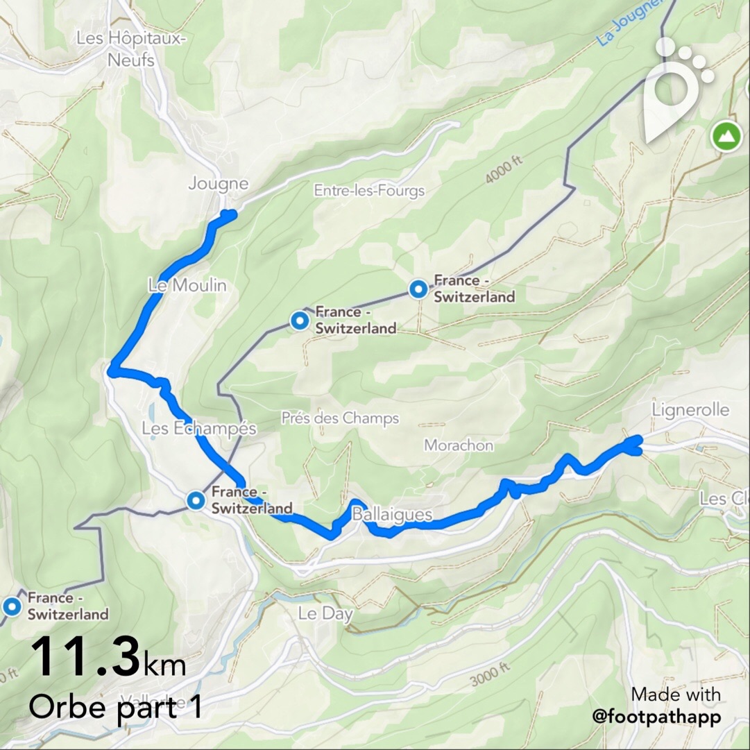 The footpath app is split again today because it wouldn’t recognize a couple paths, so I had to stop and re-chart it. We walked a little bit more than what it says–if you see in the first map, it didn’t start tracking until a bit after Jougne. It was about 21.5 km overall.